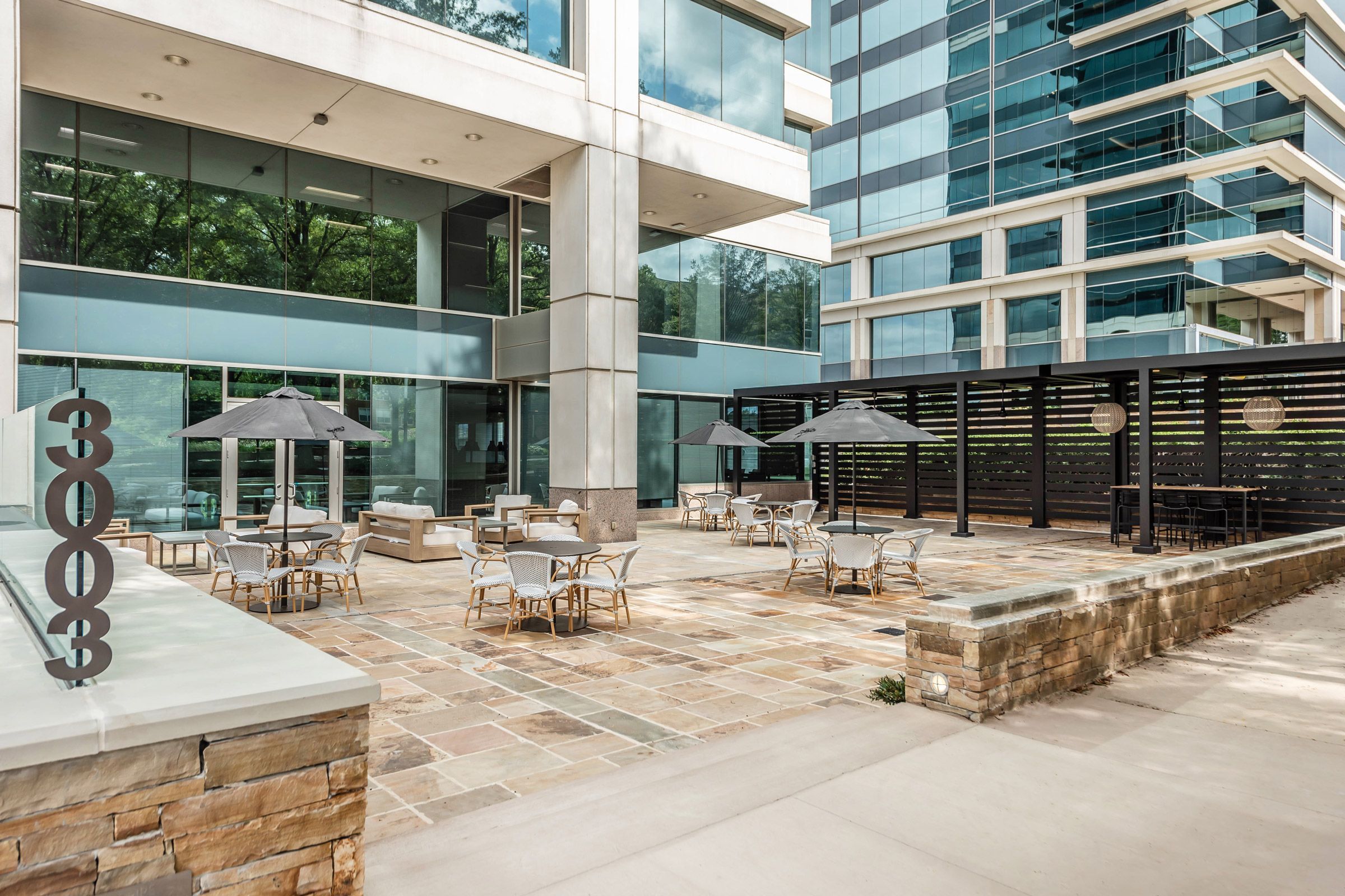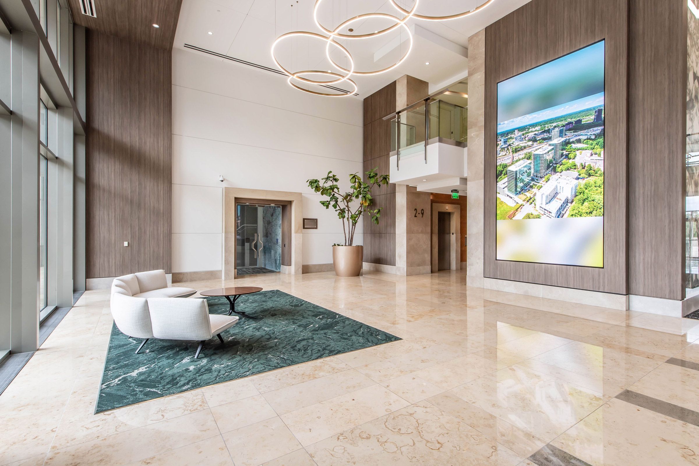 Vickers Design Group worked with Seven Oaks to update the lobby at 3003 Perimeter Summit. The goal was to enhance the connectivity with the exterior environment and bring the outside in. New finishes and a Porcelain slab feature wall create an organic feel that exudes nature. High-end finishes and fixtures give the lobby space a timeless feel and were selected to complement existing elements that would remain, including the flooring.